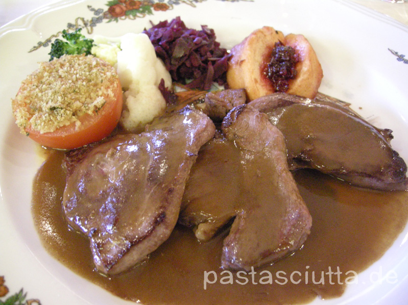 Dazu gab es gebräunte Knöpfle. Vorweg brachte man uns leckeres Blätterteiggebäck (das nicht nach Industrie-Fertigteig schmeckte) und zwischendurch gabe es noch ein Zanderfilet auf Krustentiersauce. Als Nachtisch wählte ich Nugatparfait.