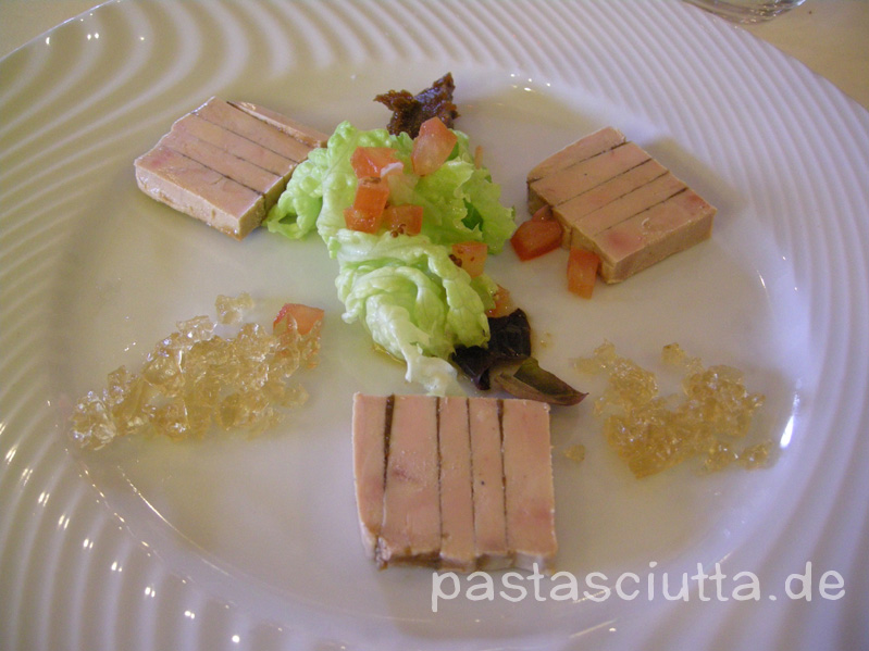 Entenleber mit Feigenmus. – Das Mus war nicht zu Marmelade gekocht, sondern schmeckte schön fruchtig. Das Weingelee gehört natürlich im Elsass trotzdem dazu.