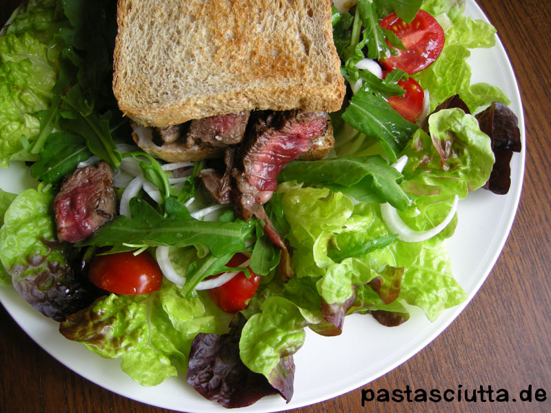 Dieser Teller macht es einem nicht ganz leicht. Wie soll man das Ding in der Mitte nur essen? Das war die Frage, die mich beschäftigte, während ich die Kamera auf diese Köstlichkeit richtete. Es handelt sich dabei um ein schönes Rib Eye Steak, mit grobem Meersalz und einem winzigen Tröpfchen Olivenöl in der gusseisernen Pfanne gebraten und anschließend in Scheibchen geschnitten. Das geschnittene Fleisch ruht zwischen zwei Scheiben Vollkorntoast und etwas Knoblauchmayonnaise (eifrei, razfatz aus Milch und Öl zusammengemixt) auf einem Bett aus Salat: Eichblatt, Rucola, Lauchzwiebel, Tomaten, Vinaigrette. – Ach so, mit einer Gabel und einem Steakmesser funktioniert die Sache recht gut!