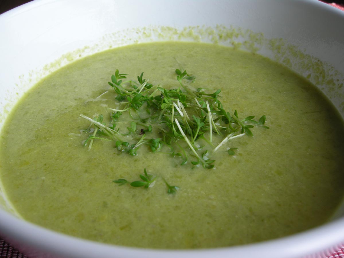 Nun sollte es aber heute auch so ein grünes Süppchen geben, wie ich es gestern bei 365 Days gesehen hatte. Das sah ja durchaus lecker aus. Das fragwürdige Grünzeug habe ich einfach durch anderes Grünzeug ersetzt, das ich noch im Hause hatte: Staudensellerie, Zwiebel, Knoblauch, TK-Zuckerschoten, Porree. Alles, bis auf die weißen Stücke vom Lauch, schön angeschwitzt, mit einem winzigen Hauch Curry, den man gar nicht herausschmecken sollte, gewürzt. Dann mit Brühe aufgegossen und weich gekocht. BRRRRT BRRRT BRRRT, mit dem Zauberstab alles aufgemixt und danach den sehr fein geschnittenen Porree hinzugefügt. – Sobald das Gemüse weich ist, etwas Sahne hinzufügen und mit Kresse servieren.