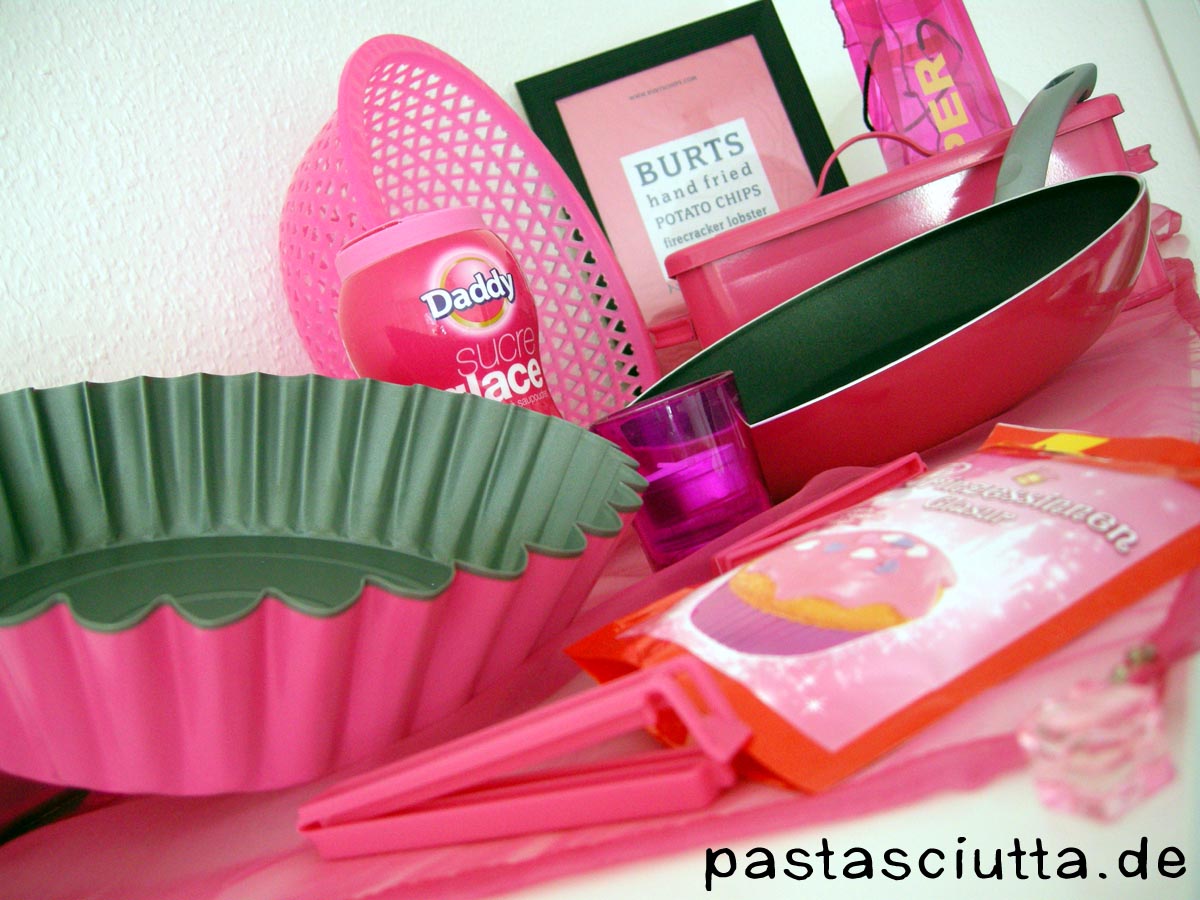Jetzt erst einmal Pink Stuff. Wie schon bei der WohnSchwester erwähnt, würde mein ganzes Arsenal an Pink jedes Bildformat sprengen. Deshalb habe ich mich auf Küchenzeug beschränkt. War schwierig genug, alles auf ein einziges Bild zu bekommen.