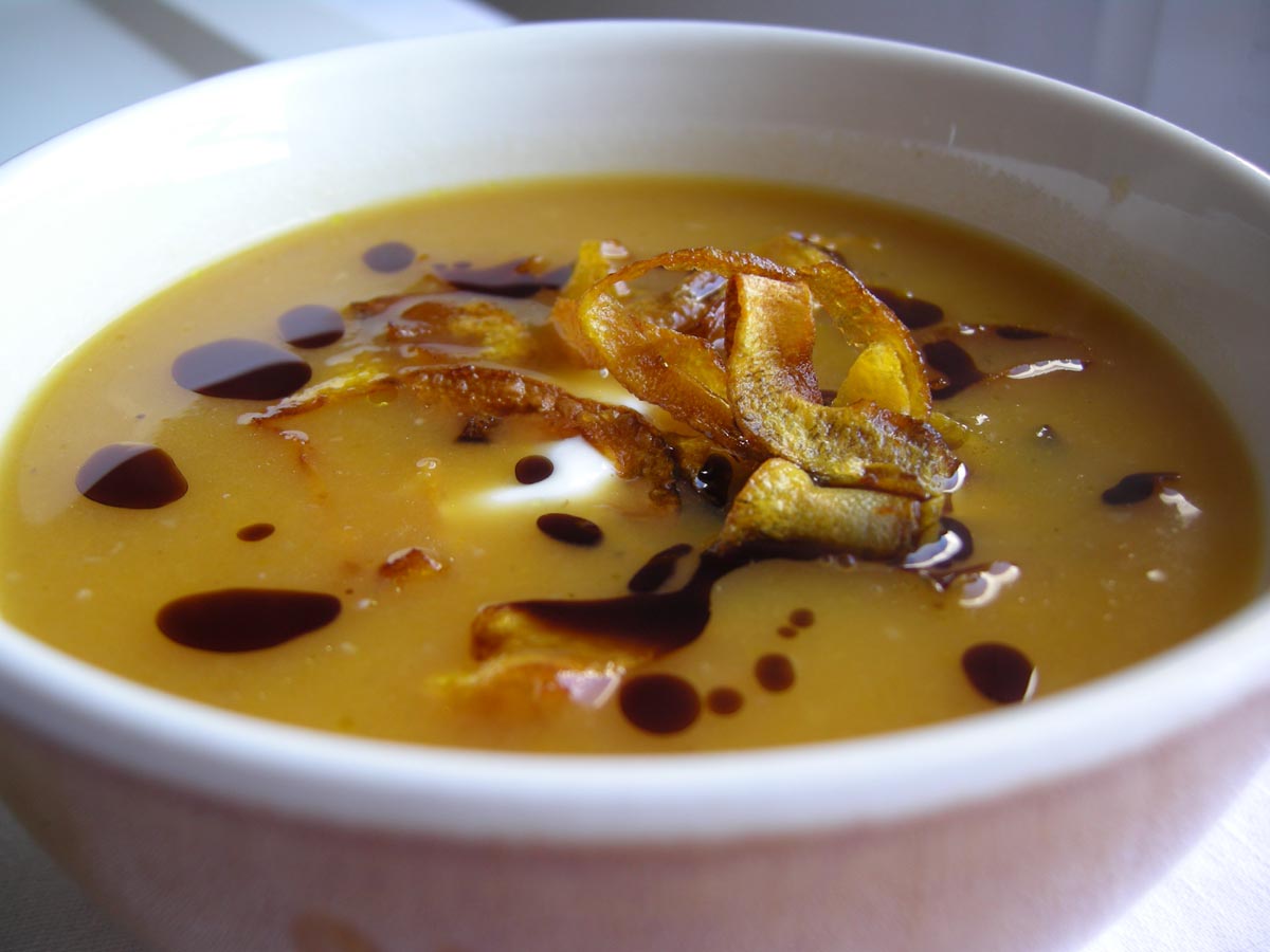 Aufgetischt wurde die Suppe mit Kürbischips – WA-HAU!, cremigem Joghurt (spitzenmäßiger Tipp zur Kürbissuppe von Vincent Klink!) und Kürbiskernöl. – Extrem einfach, aber lecker!