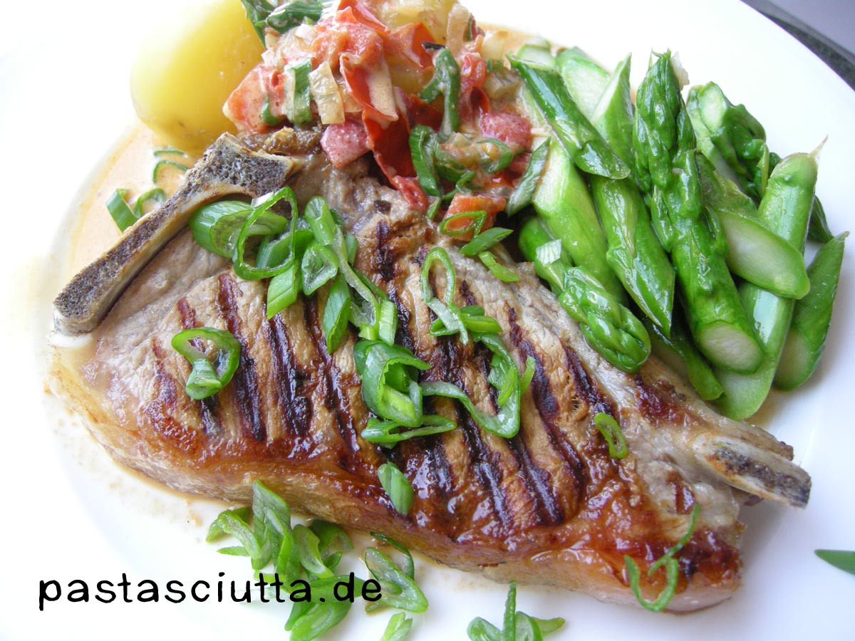 Nachdem sich alle so schön zum Thema Kalorien geäußert haben, verstecke ich die bösen Tierchen jetzt einfach mal. Wir sehen ein herrliches Kalbskotelett aus der Grillpfanne, nackige Karoffeln und Grünspargel aus der Pfanne. Die überaus köstliche Sauce befindet sich zu unterst auf dem Teller und wird von den vermeintlichen Hauptakteuren gut versteckt.