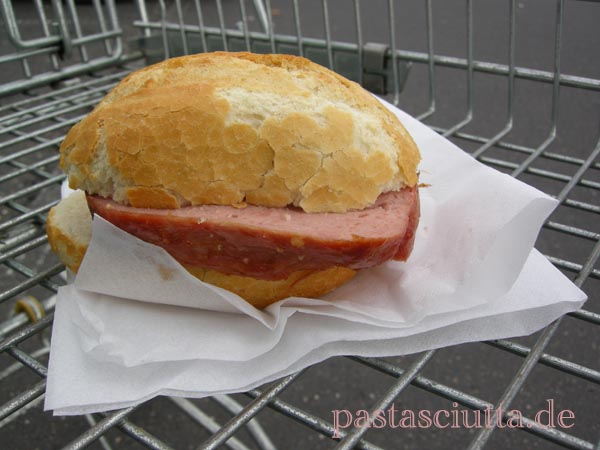 Der Supermarkt verkauft dicke Remmel von frisch gebackenem Fleischkäse zwischen zwei Brötchenhälften für unschlagbare 1,20 Euro. Fett und Hitze lassen das Brötchen augenblicklich zu zwei Pappdeckeln zusammenschmelzen, sobald man hineinbeißt.