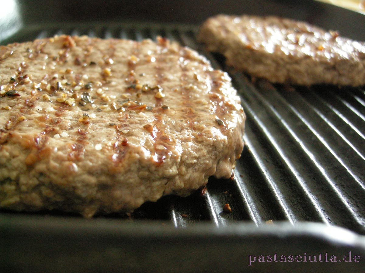 Auf dem Landeanflug nach Hause, nahm ich ein bisschen Tatar mit. Da muss man sich auch beim Einkauf gar nicht lange aufhalten. Zu Hause habe ich daraus zwei Portionen gemacht und auch noch was für den Kater abgeteilt. Die beiden Klopse kamen mit Hilfe eines Metallrings in Form und wanderten danach, bestreut mit Salz, in die knackeheiße Grillpfanne. Auf das heiße Fleisch kommt zum Schluss noch etwas Grillpfeffer.
