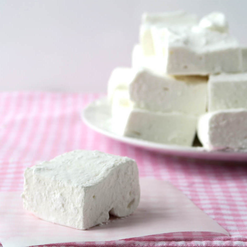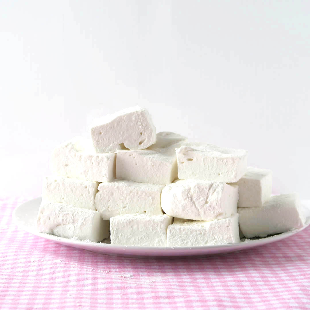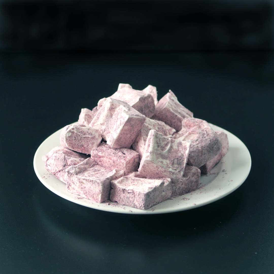 Variante: Blueberry Marshmallows (erstes Bild, oben). Die Stärke/Puderzuckermischung mit Pulver aus dehydrierten Blaubeeren mischen und die geschnittenen Marshmallows darin wenden. Achtung: Die Farbe bleibt nicht so dezent wie auf dem Foto! Das Blaubeerpulver zieht ein bisschen Feuchtigkeit und bekommt dadurch eine kräftigere Farbe.