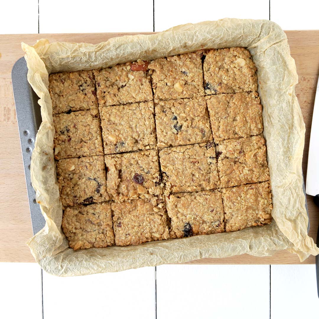 Kommen wir also zurück zu der spaßigen Variante. Die kleinen Buddy’s Flapjack Biscuits begegneten mir bei Jamie Oliver auf Instagram. Die gehen so einfach, das kann ich auch, dachte ich. Und außerdem sind die Zutaten sowieso im Haus. – Na, jedenfalls meistens. Unschlagbar schnell sind die kleinen Müeslikekse zudem, da sie nicht einzeln geformt werden müssen. Der Teig wird nur in die Form gedrückt und nach dem Backen ganz einfach in Stücke geschnitten. Um genau zu sein, in 16 Stücke, denn das ist nicht unwichtig.