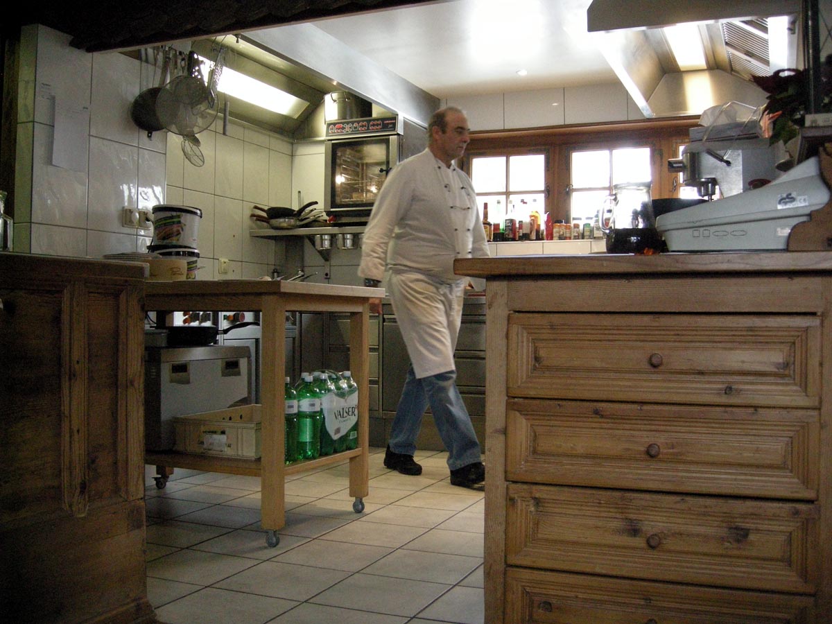 Die blitzsaubere Küche steht in einer warmen Bündner Gaststube, blankes Edelstahl fügt sich in holzgetäfelte Gemütlichkeit. Gut gelaunte Gäste, die voller Vorfreude warten und kleine Brote aus Tontöpfchen mit frisch geschlagener Kräuterbutter verzehren. Die freundliche Serviertochter bringt ein paar Scheiben gefüllte Kalbsbrust, die fast schon als komplette Mahlzeit durchgehen. Das dünn geschnittene Fleisch schmeckt aber so unwiderstehlich frisch, dass jede Vernunft besser gleich über Bord geht. Zum Amuse gueule gibt es Rosé mit Holunderblütensirup und Wasser, frisch vom Brunnen vor der Tür.
