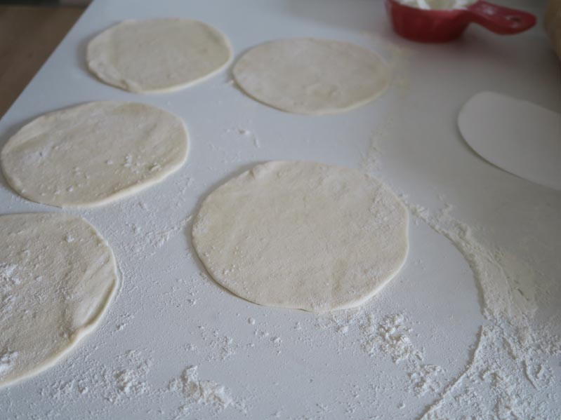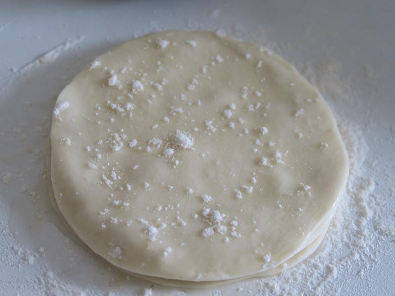 Eine beschichtete Pfanne auf mittlerer Stufe erhitzen. Den Teig zunächst zu einer Kugel formen und dann mit einem Finger durch die Mitte pieksen und den Teig zu einem Donut formen. Den Donut an einer Stelle aufschneiden, so dass ein gleichmäßiger Strang entsteht den Strang in 10 gleichgroße Stücke schneiden. Zunächst 5 Teigstücke rundformen und nach einander etwa handtellergroß ausrollen. Eine ausgerollte Teigscheibe mit Öl einpinseln, eine Prise Mehl darüber streuen und eine weitere Teigscheibe darauf legen. Genau so mit den drei weiteren Scheiben verfahren, aber die letzte Scheibe nicht mit Öl einpinseln. Auf der Arbeitsfläche liegt nun ein Stapel Teigscheiben. Diesen Stapel mit Hilfe von etwas Mehl auf ungefähr 22 cm ausrollen. Jetzt kommt es ein bisschen aufs Auge und Gefühl an. Den kompletten, ausgerollten Stapel in die heiße Pfanne geben und von jeder Seite etwa 20 Sekunden erhitzen. Die Teigscheiben sehen nicht mehr roh aus, wenn sie fertig sind und nach dem Wenden blähen sie sich auch leicht auf, wenn sie gar sind. Den Stapel auf einen Teller legen und abgedeckt ein bisschen abkühlen lassen. Danach vorsichtig trennen. Die Schichten sollten leicht trennbar sein und nicht zerreißen.