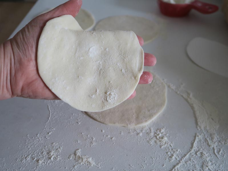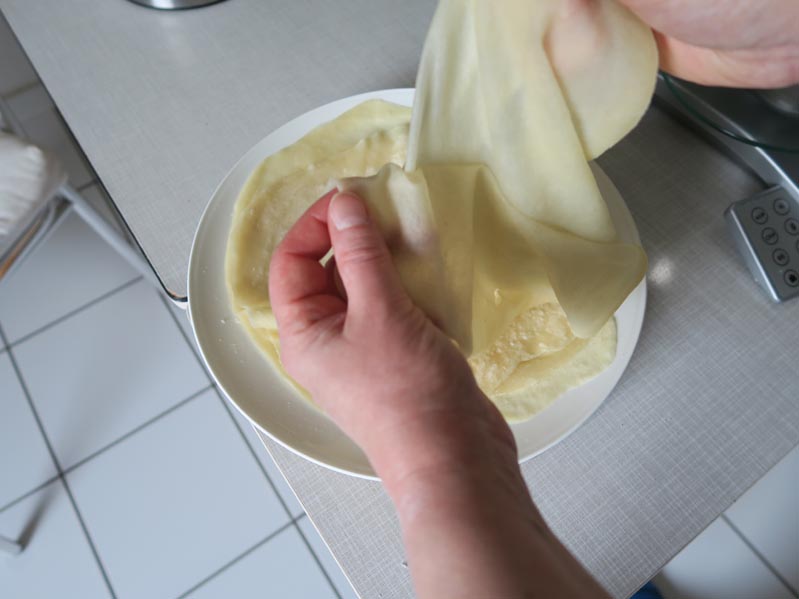 Tipp: Zunächst getrennt und dann wieder gestapelt lässt sich der fertige Frühlingsrollenteig gut für ein paar Tage einfrieren. Zum Auftauen unter lose aufgelegte Folie oder ein leicht feuchtes Tuch legen.