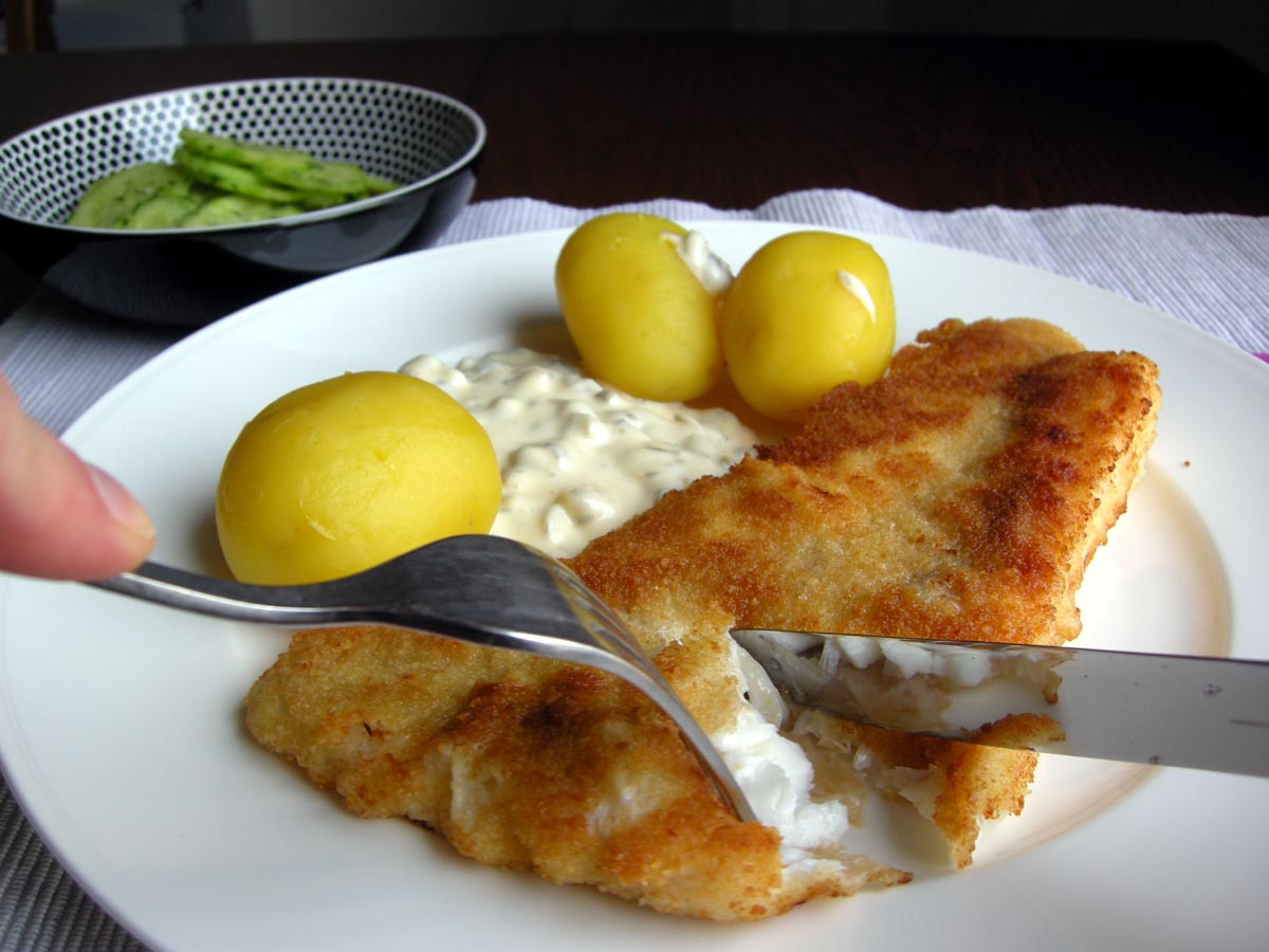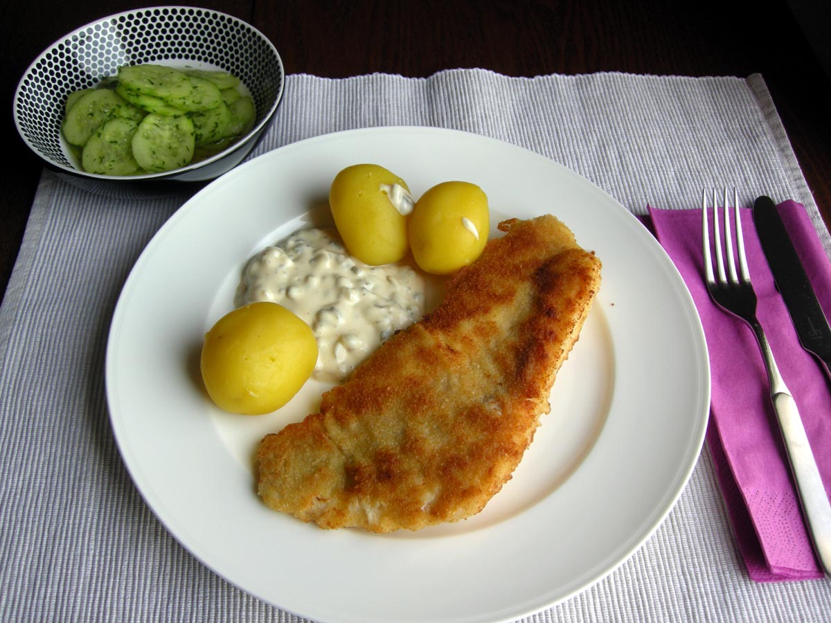 Das Fischlein trägt heute eine goldgelbe Panade aus ebenfalls klassischen Grundzutaten, Ei, Mehl und Paniermehl.. Das Ensemble wird umspielt von perfekt gerundeten Pellkartoffeln in frühlingsfrischem Gelb sowie zartgrünem Gurkensalat. Na, auch Appetit bekommen?