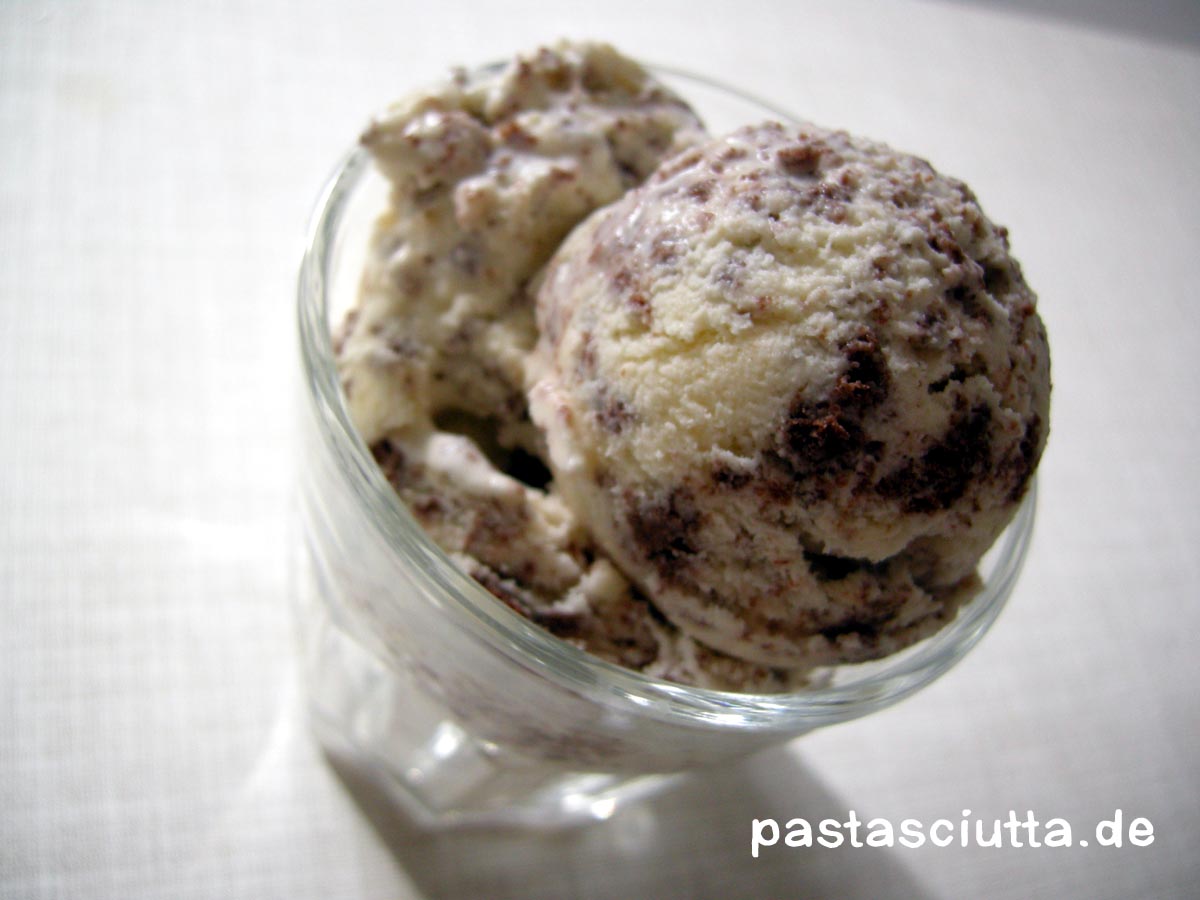 Sobald die Maschine ihr Werk verrichtet hat, kann man leckere Sachen in das Eis rühren, bevor es zum Nachfrosten in den Tiefkühler geht. In diesem Fall habe ich Polnischen Schokokuchen zerkrümelt und großzügig unter das Eis gemischt. Das Rezept habe ich hier schon einmal aufgeschrieben und dieses Mal in 50 Minuten in einer großen Form gebacken.