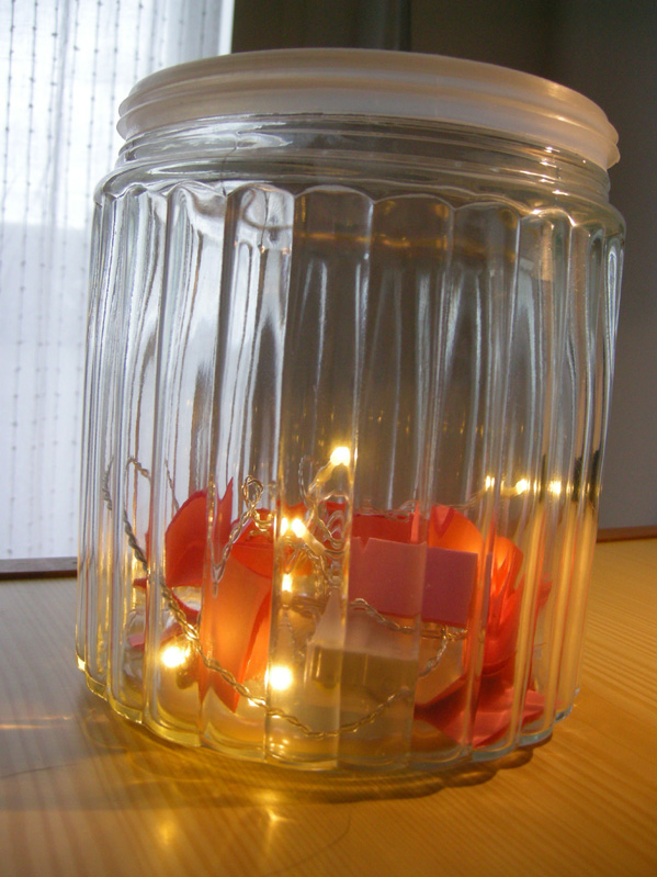Die Lostrommel: Ein großes Bonbonglas mit Lichterkette.