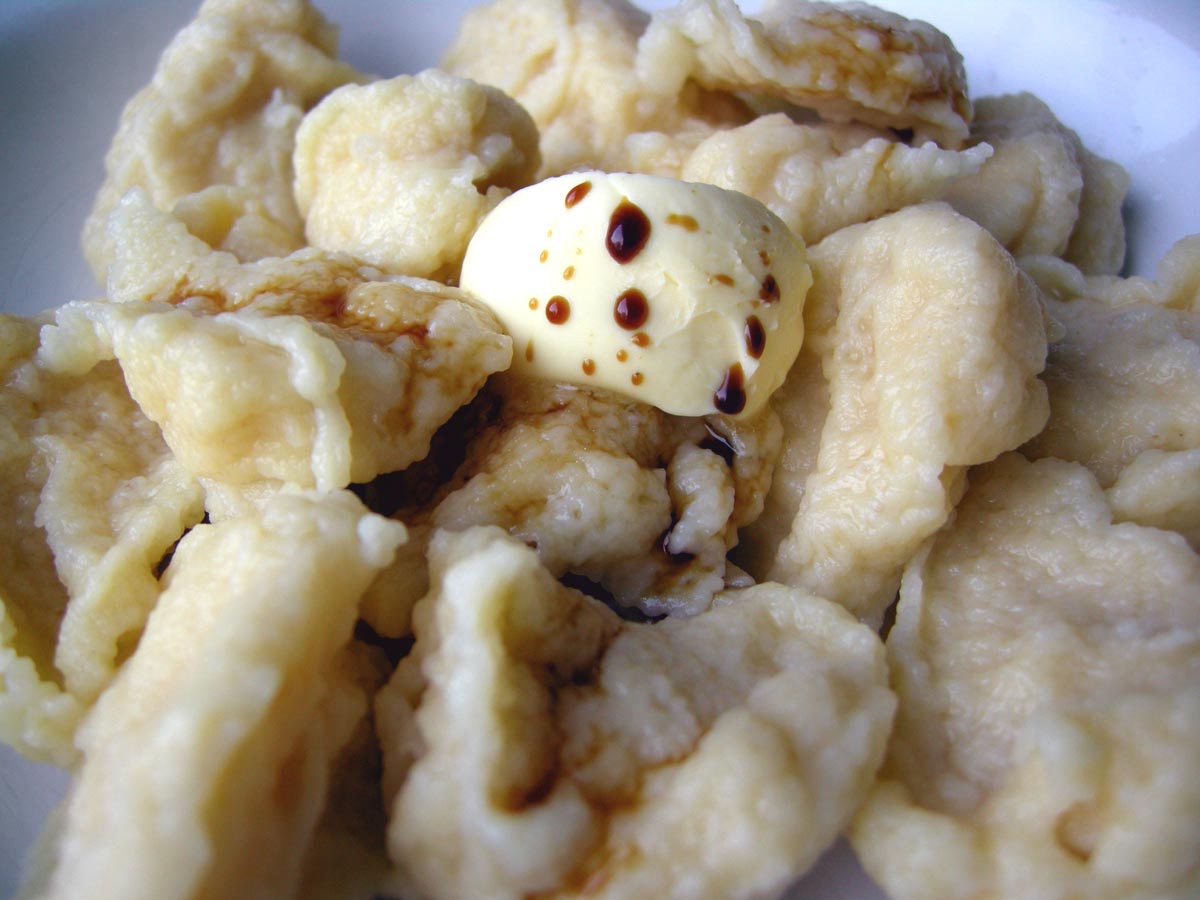 Daraus entsteht ein „halb fester“ Teig, von dem mit zwei Löffeln Nocken abgestochen werden, die man in siedendes Wasser gleiten lässt. Kurz warten, bis die Nocken nach oben schwimmen und eventuell dabei etwas nachhelfen. Danach sollen die Mehlklösschen noch zwei bis drei Minuten ziehen. Die fertigen Klösschen abschöpfen und kurz abtropfen lassen.
