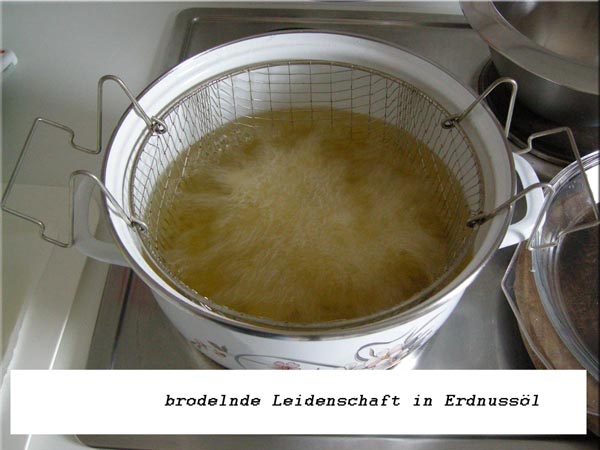 Beim Fett geht nichts über hoch erhitzbares Pflanzenöl. In dieser Kategorie unschlagbar: Erdnussöl. Bekommt man meist im Asia-Shop. Oder man bringt sich das Wundermittel aus Belgien, Frankreich oder der Schweiz mit. Dort steht es überall zu einem vernünftigen Preis im Supermarkt. Sollte Erdnussöl nicht aufzutreiben sein, dann geht auch anderes hochwertiges Öl, das ausdrücklich zum Frittieren geeignet ist. Olivenöl funktioniert eigenartigerweise auch.