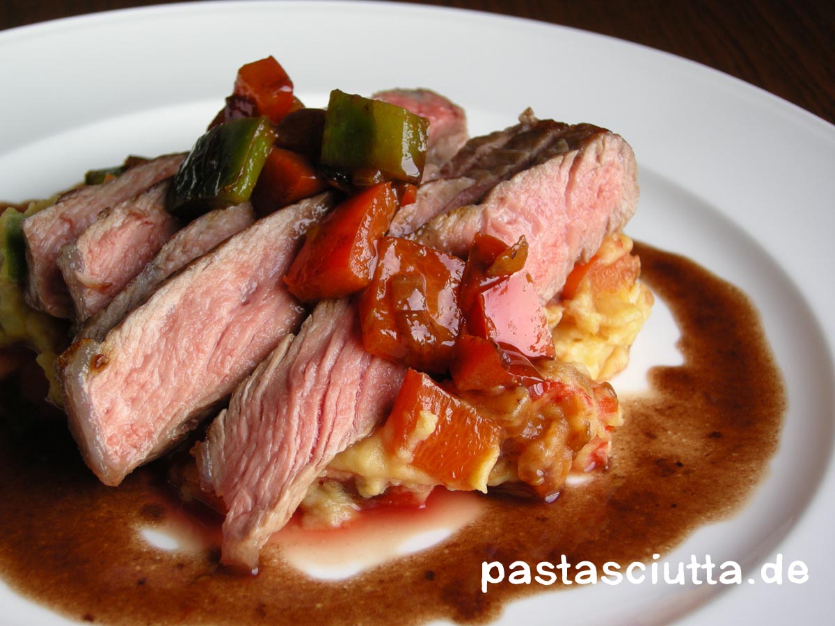 Am Ende blieb dann keine Zeit mehr für Geschmortes. Daher mal wieder ein Schnellschuss, -schnell gekauft und schnell gekocht. Rumpsteak, rückwärts gegart, auf Paprika-Kartoffelpüree. Für das Bettchen wurden rote und grüne Paprika mit Zwiebeln und Knoblauch in Olivenöl angebraten und mit geschnittenen Tomaten vermischt. Nach dem Abschmecken mit Salz, Pfeffer und Kreuzkümmel alles locker unter eine Portion Kartoffelpüree ziehen. Dazu ein leckeres Sößchen aus Bratensatz, Kalbsfond, Rotwein und einem winzigen (immer rein mit dem Zeug!) Klecks Butter.