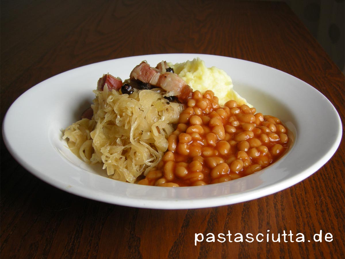 Unter der Woche finde ich es manchmal recht schwierig, ein vernünftiges Mittagessen zu bekommen. Wobei „vernünftig“ eigentlich nur sagt, dass ich darauf Appetit haben muss und dass es mich satt und zufrieden macht. Wenn ich dann etwas essen muss, was mir nicht hundertprozentig zusagt, bekomme ich schlechte Laune, und der Nachmittag ist ruiniert. Gestern war zum Beispiel so ein Tag, mit aufgewärmten Nudeln. Immerhin ist es mir abends dann noch gelungen, eine Portion Sauerkraut mit Speck, Riesling und Wacholder zu kochen, die für heute mit reichte. Dazu gab es heute Mittag wunderbar cremiges Kartoffelpüree und Baked Beans. Ganz nebenbei blieb sogar noch Zeit, einen meiner Lieblingskuchen zu backen, den ich hier schonmal vorgestellt habe. Der Nachmittag kann kommen, ich bin bereit!