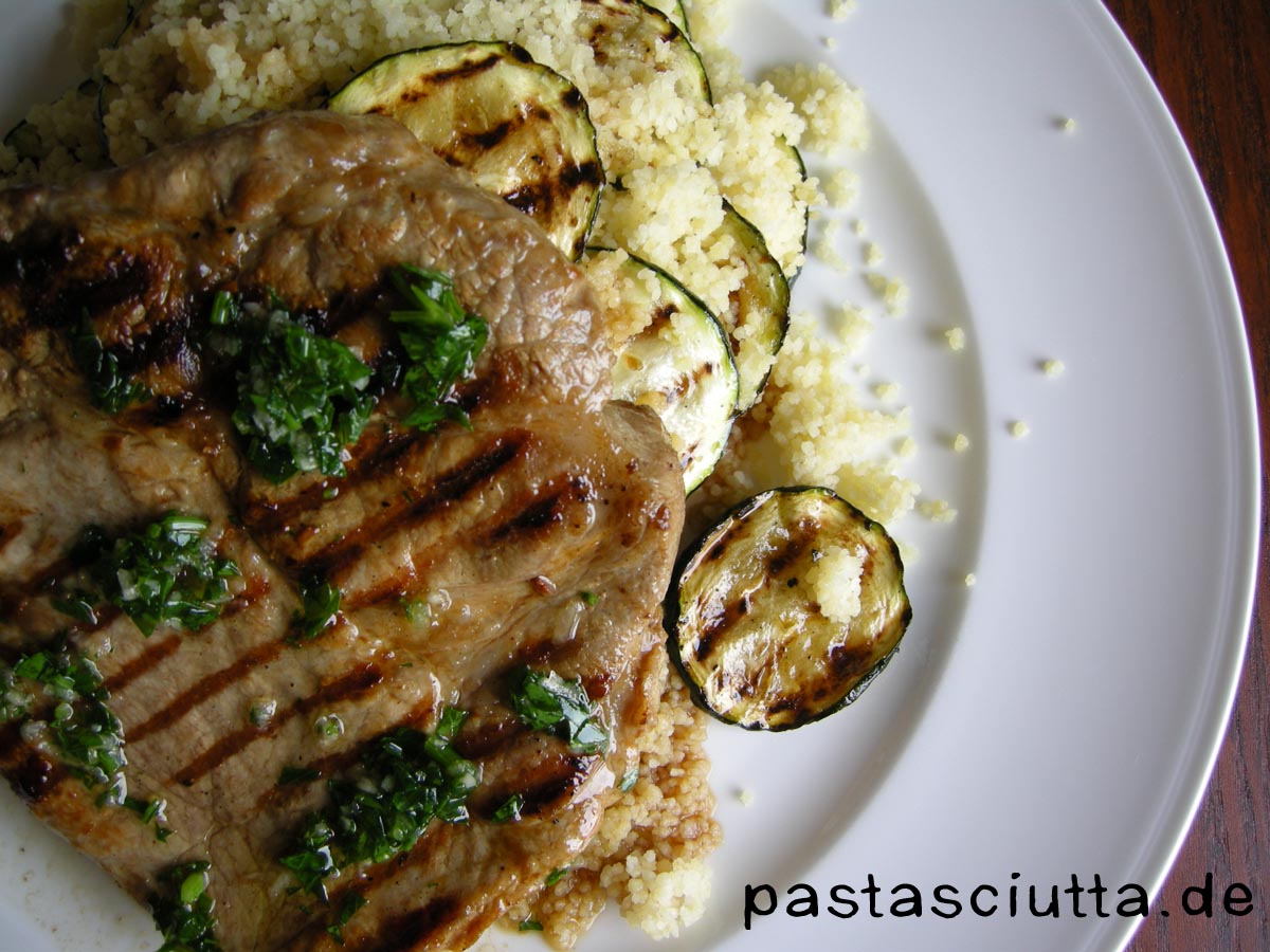 Ein paar Zucchinischeiben aus der Grillpfanne, ein Schweinenackensteak, etwas Petersilien-Knoblauch-Olivenöl und natürlich reichlich Meersalz. So lasse ich mir die Sommerküche schmecken.