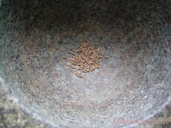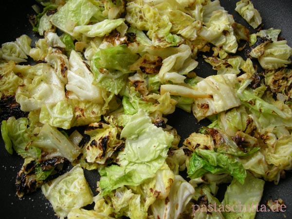 Das Stück Wirsing aus dem Kühlschrank war der eigentliche Hit. Im Rubbedidup kleingehauen, durch die superheiße Pfanne gewirbelt und mit Knoblauch sowie reichlich Kreuzkümmel, Salz und Pfeffer gewürzt. Geht so schnell, dass ich mit der Kamera kaum hinterher kam. Die äh, – Röstaromen sind erwünscht. Zusammen mit den knackigen Kohlblättern machen sie den Witz an diesem Gericht aus.