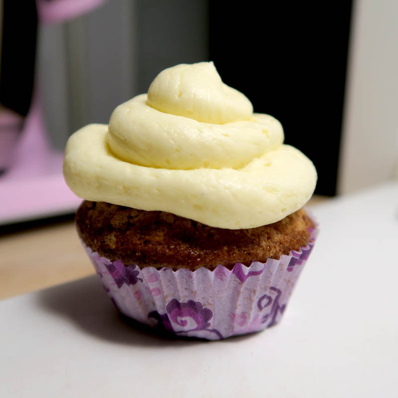 Die Konditorcreme unterrühren und schlagen, bis die Creme leicht und luftig aussieht, etwa 2 bis 3 Minuten. Umgehend in einen Spritzbeutel füllen und die Cupcakes damit verzieren. – Viel Spaß!