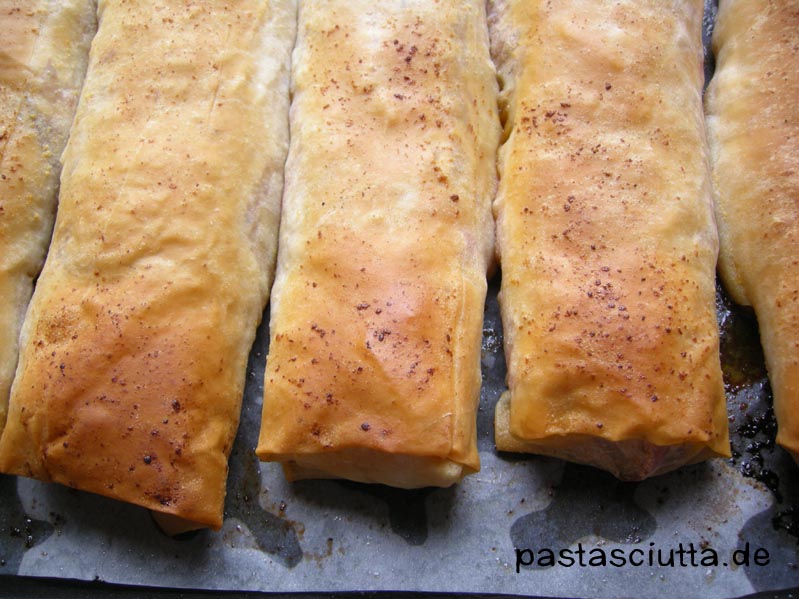 Leider hat mir der Fertigteig überhaupt nicht geschmeckt. Beim nächsten Mal mache ich mir dann doch wieder die Mühe, frischen Strudelteig vom Bäcker zu holen.