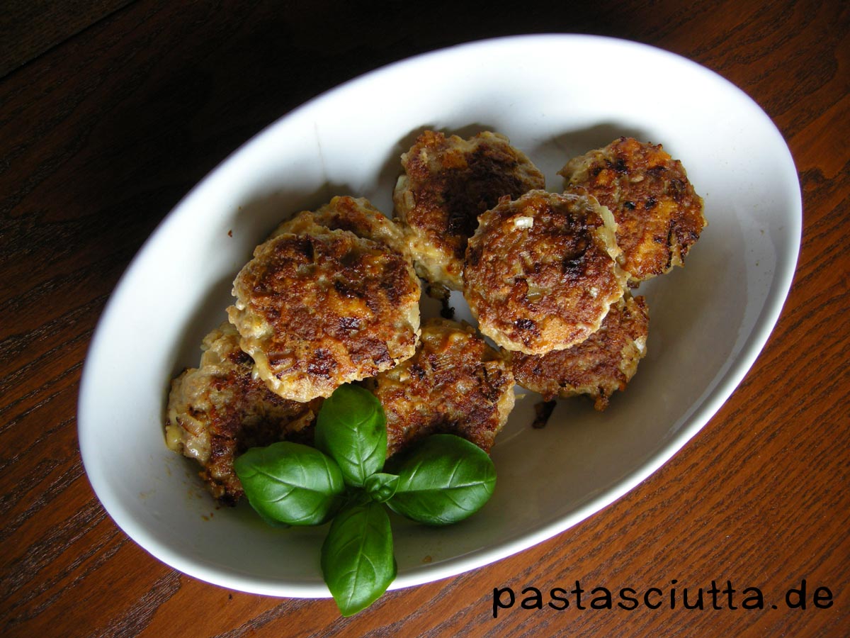 Alles gründlich mischen und zu Klopsen formen. In einer beschichteten Pfanne mit wenig Öl langsam braten. Nicht zu früh wenden.