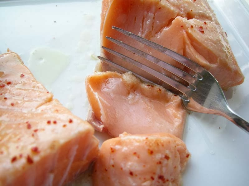 Das Ergebnis ist gut sichtbar, oder? Derartig zubereiteter Lachs ist toll für alle, die es gerne saftig aber nicht glibberig mögen. Ich mag das zwar auch, bin aber letztlich ein Gewohnheits-Esser. Das heißt bei mir wird es den Lachs auch weiterhin eher kurz angebraten aus der Pfanne geben, schön glibberig in der Mitte. Gewürzt wird derzeit nur mit Fleur de Sel und Gochugaru. Und ein bisschen zerlassener Butter.