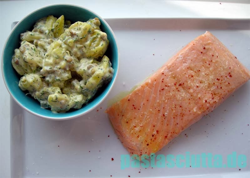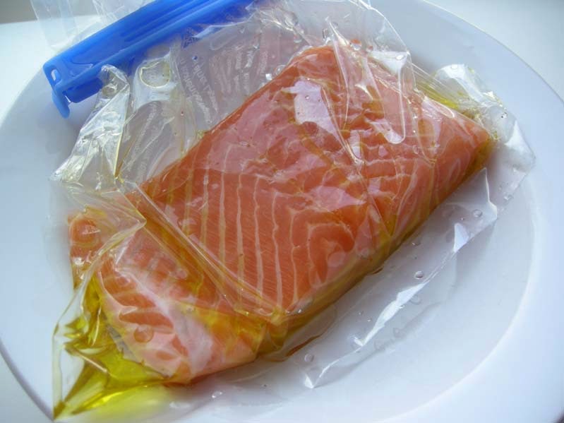 Der Lachs hat sich aber auch gefreut. So sehr, dass er in die Tüte musste, mit etwas Olivenöl. Die Tüte drückt man in einen großen Topf mit Wasser, so dass die Öffnung noch heraus schaut. Dann entweicht die Luft aus dem Beutel und man kann den Beutel mit einem Vakuumclip verschließen. Ist dann vielleicht nicht ganz Sous vide aber immerhin vide. – Für den Lachs reicht das vollkommen. Das Wasser in dem Topf erhitze ich auf 45°C. Die Temperatur muss ich mit einem Thermometer beobachten und zur Korrektur halte ich ein bisschen heißes und kaltes Wasser bereit. Der Lachs darf nun in seinem Beutel 15 Minuten schwimmen.