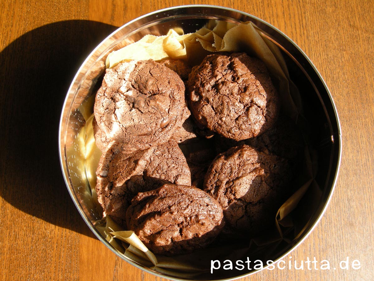 Falls es bei Schokolade sowas wie eine Überdosis geben sollte, dann sind wir heute ganz nahe daran. Mehr Schokolade geht einfach nicht in ein unschuldiges Plätzchen hinein. Das Rezept hat bereits eine beachtliche Tour durch die Blogs hinter sich gebracht, was eindeutig für die Qualität spricht.