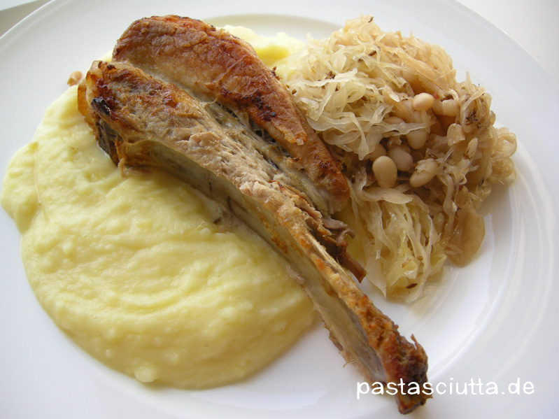 Sauerkraut mit weißen Bohnen, Schweinerippchen und Kartoffelpüree.