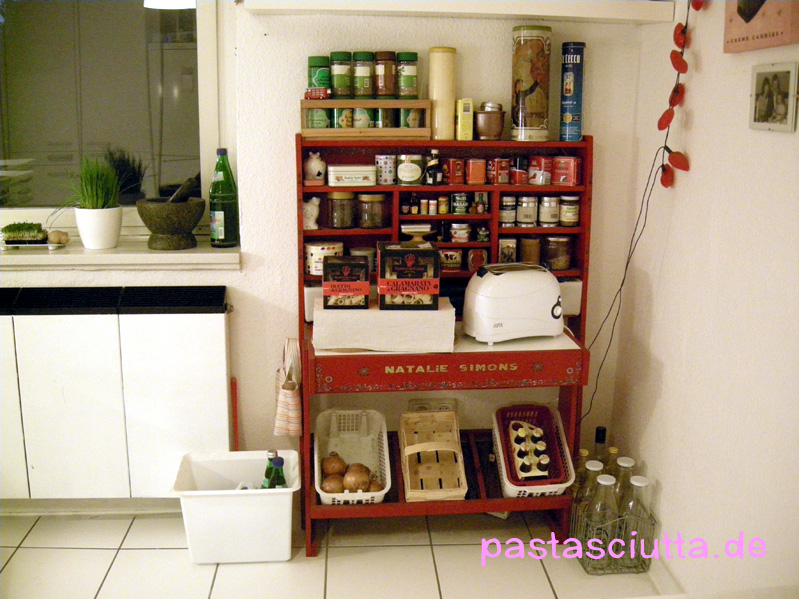 Heute verwahre ich in dem Regal einen Teil meiner Gewürze und ein paar Souveniers. Witzigerweise steht darin, genau wie damals, eine Miniaturflasche Maggi. Auf dem Ladentisch liegen, unter einem Tuch, meine Schamottsteine, auf denen ich Pizza backe.