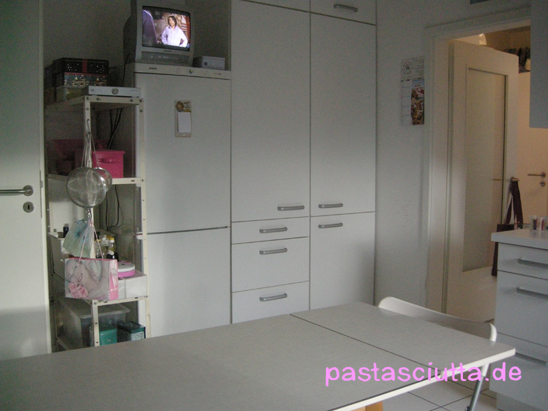 Wenn ich auf diesem Tisch wirklich etwas zubereiten will, dann muss ich beide Türen schließen, damit die Katzen nicht rein können. Man sieht es deutlich, die Küche ist ein Durchgangszimmer.