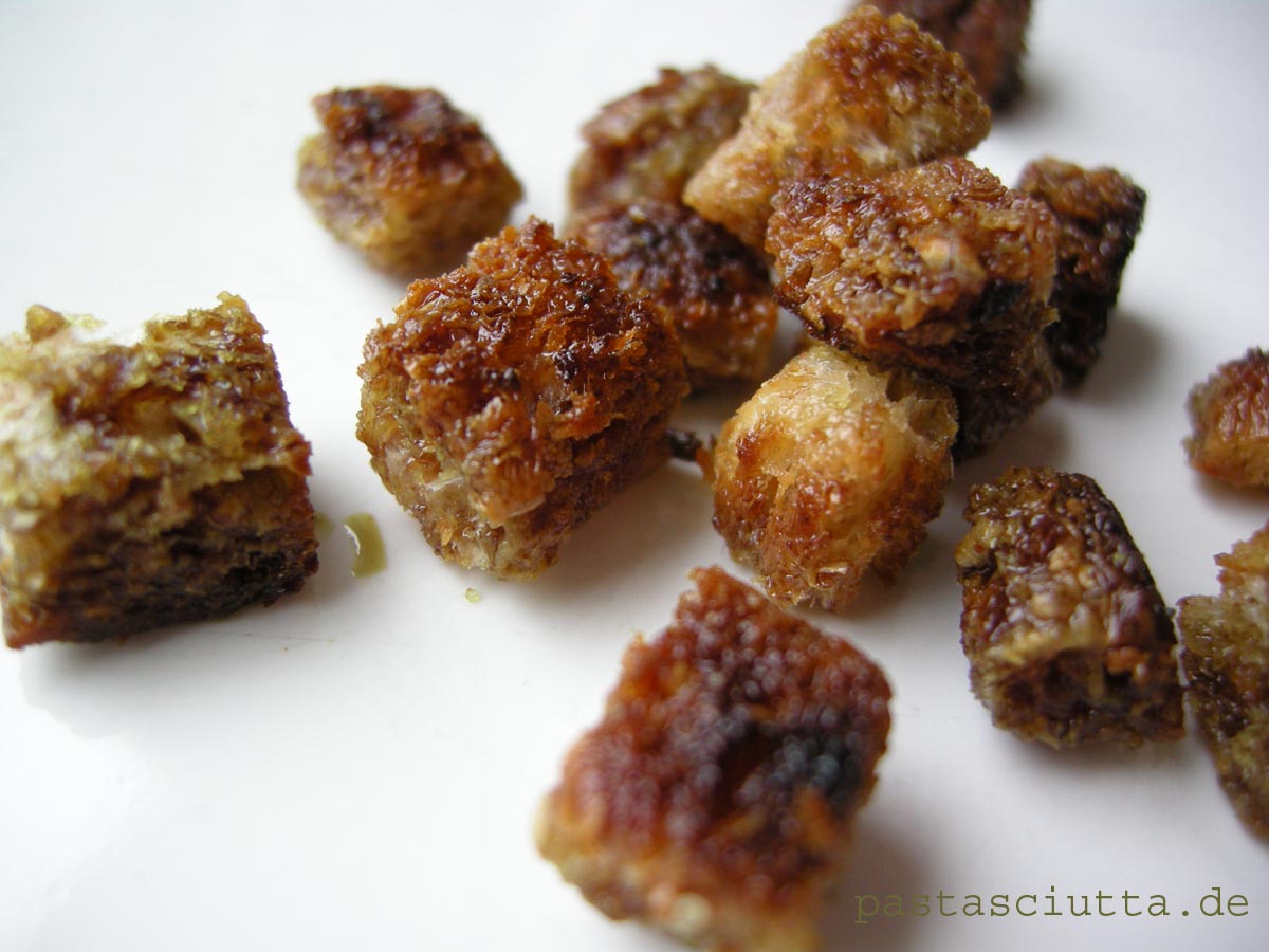 Eigentlich sollte das ein Nachschlag zur Kürbissuppe werden. Als ich die erste Ladung der Kürbiskernölcroutons gestern abend herstellte, um die aufgewärmte Suppe damit zu adeln, war die Batterie der Kamera leer. Natürlich hätte ich auch ein paar Croutons übrig behalten können, um sie heute zu fotografieren, aber seien wir mal ehrlich. Wer hätte das schon geschafft?