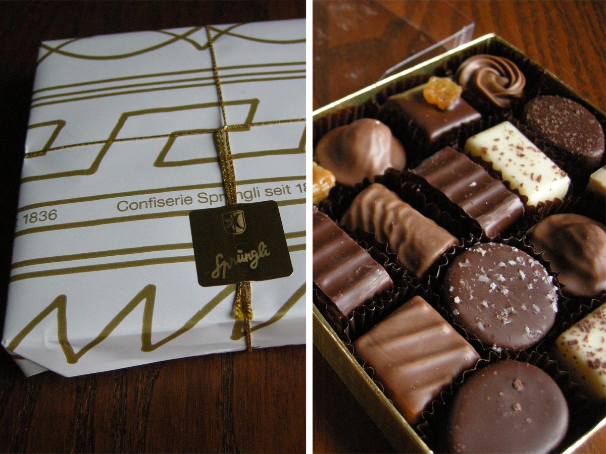Man glaubt ja nicht, wie schnell diese Pralinen sich in Luft auflösen! Ob es an der langen Reise liegt? Vielleicht halten sich die süßen Delikatessen auf der Zürcher Bahnhofstraße länger? Ich stelle mir reiche Damen im Pelzmantel vor, die mit spitzen Fingern nach Kalorien greifen. Ach, eins kann ich noch… Gelegentlich besuche ich die Seite von Sprüngli, wo ich im Onlineshop ein Kästli mit Luxemburgerli zusammenstelle. Nur mal so, zum Kucken. Dann reiße ich mich aber zusammen. Bestellen tu‘ ich die kleinen Luxushappen nie, weil ich immer denke, dass sie am besten superfrisch vor Ort gegessen werden sollten.