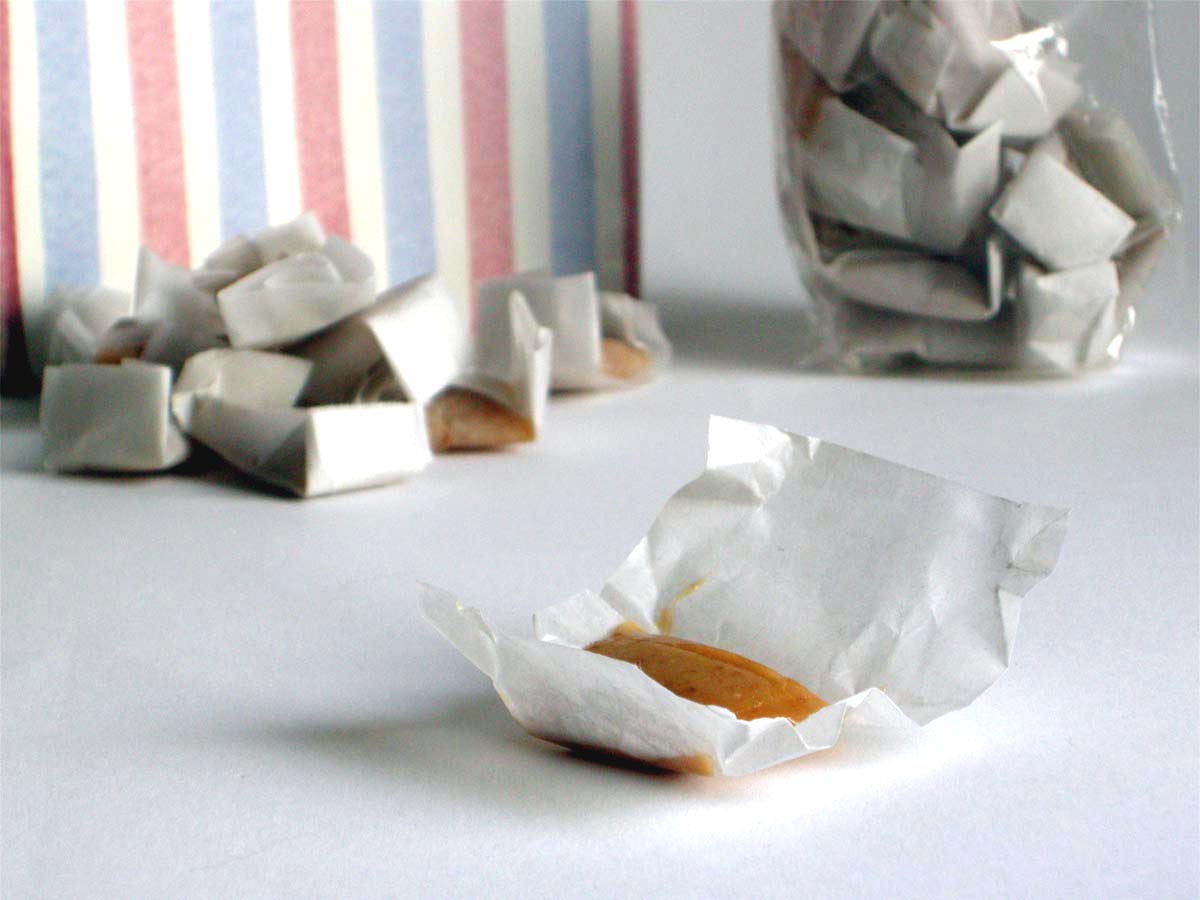 Während des Abkühlens lässt sich die Zeit sinnvoll nutzen, um Wachspapier zurecht zu schneiden. Das ist die ideale Verpackung für klebrige Karamellbonbons. Der Tipp stammt von Nicole Stich, nachzulesen bei Küchengötter.