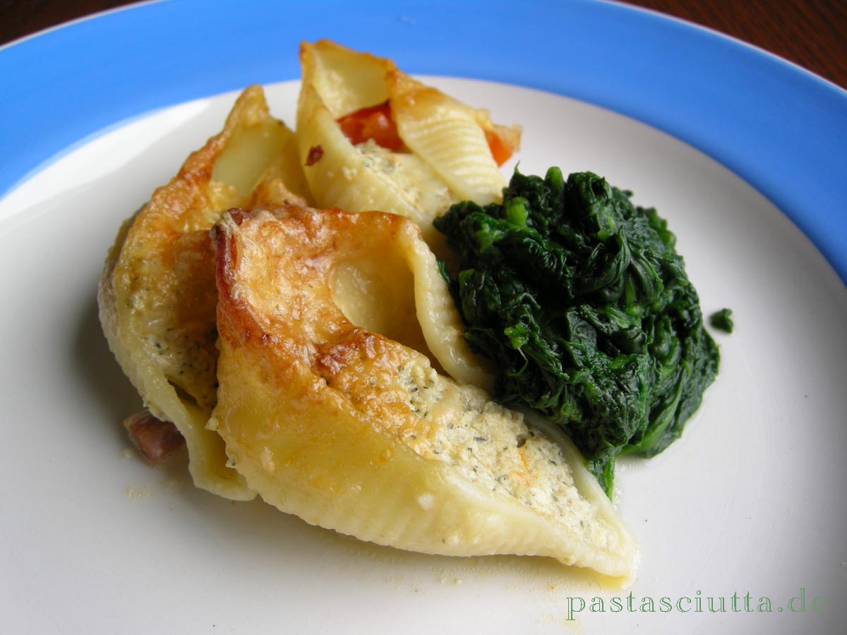 Cannelloni eignen sich wunderbar als Trägerrakete für das Kürbiskernfeuerwerk. Aber auch große Conchiglie sind sehr schön, und rein zufällig noch im Vorrat. Die Füllung streiche ich einfach mit einem Messer in die Muschelpasta, die ich dann in eine feuerfeste Form setze. Anschließend streue ich gehackten Knoblauch und Speckwürfelchen darüber und gieße etwas Brühe sowie ein ganz kleines Schlückchen Sahne an. Auch eine gewürfelte Tomate macht sich gut in dieser Mischung. Bei 200° C geht die Pasta für etwa 25 Minuten in den heißen Ofen. Kurz vor Schluss ein bisschen geriebenen Parmesan darüber streuen und nochmals kurz in den Ofen schieben. Dazu passt eine Portion Blattspinat.