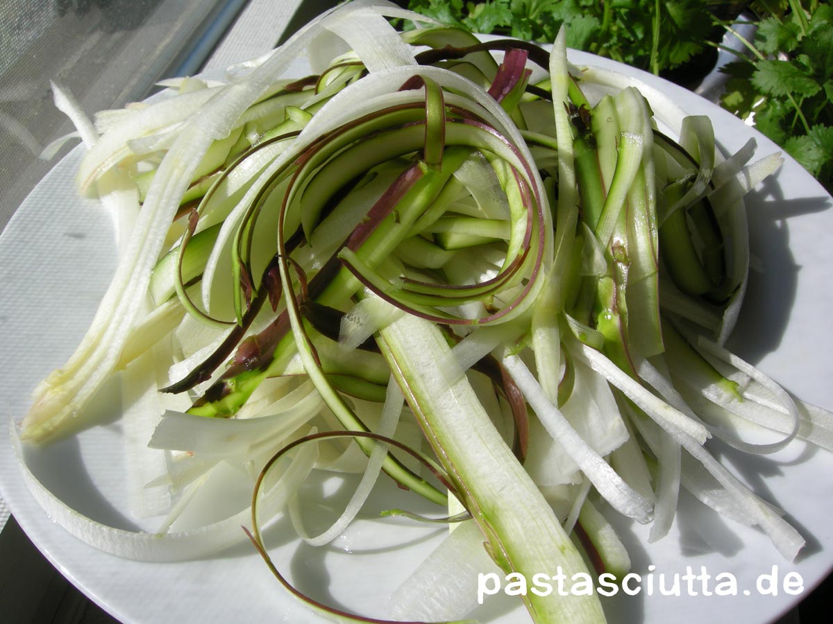 Spargel schälen und danach weiter mit dem Spargelschäler bearbeiten. Die Stangen mit dem Schäler komplett in Streifen schneiden.