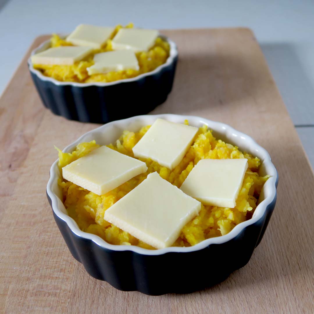 Je nach Geschmack und Verwendungszweck kann die Gemüsemasse in einer großen flachen Auflaufform oder aber in kleinen individuellen Förmchen gebacken werden. Den Käse in Stücke brechen oder schneiden und auf dem Gemüse verteilen.