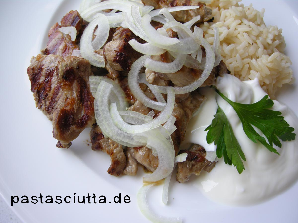 Zunächst landet ein Teil des Schweinefleischs mit etwas Salz in der Grillpfanne, wo es sich als herrlicher Gyrosersatz entpuppt. Mit Zwiebeln, Reis und Joghurt ergibt das ein vollständiges Essen.