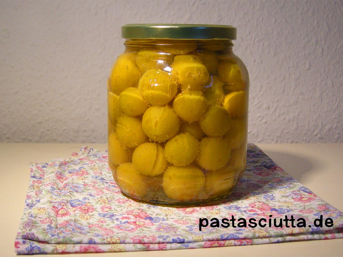 Bei den kleinen Kugeln handelt es sich übrigens um eingemachte Mirabellen, die meine Eltern mir irgendwann mal aus Frankreich mitgebracht haben. Zu meiner großen Überraschung stellte ich beim Öffnen des Glases fest, dass sie nicht in Flüssigkeit schwimmen, sondern in Gelee liegen. Die Früchte duften herrlich, schwächeln dafür aber etwas im Geschmack.