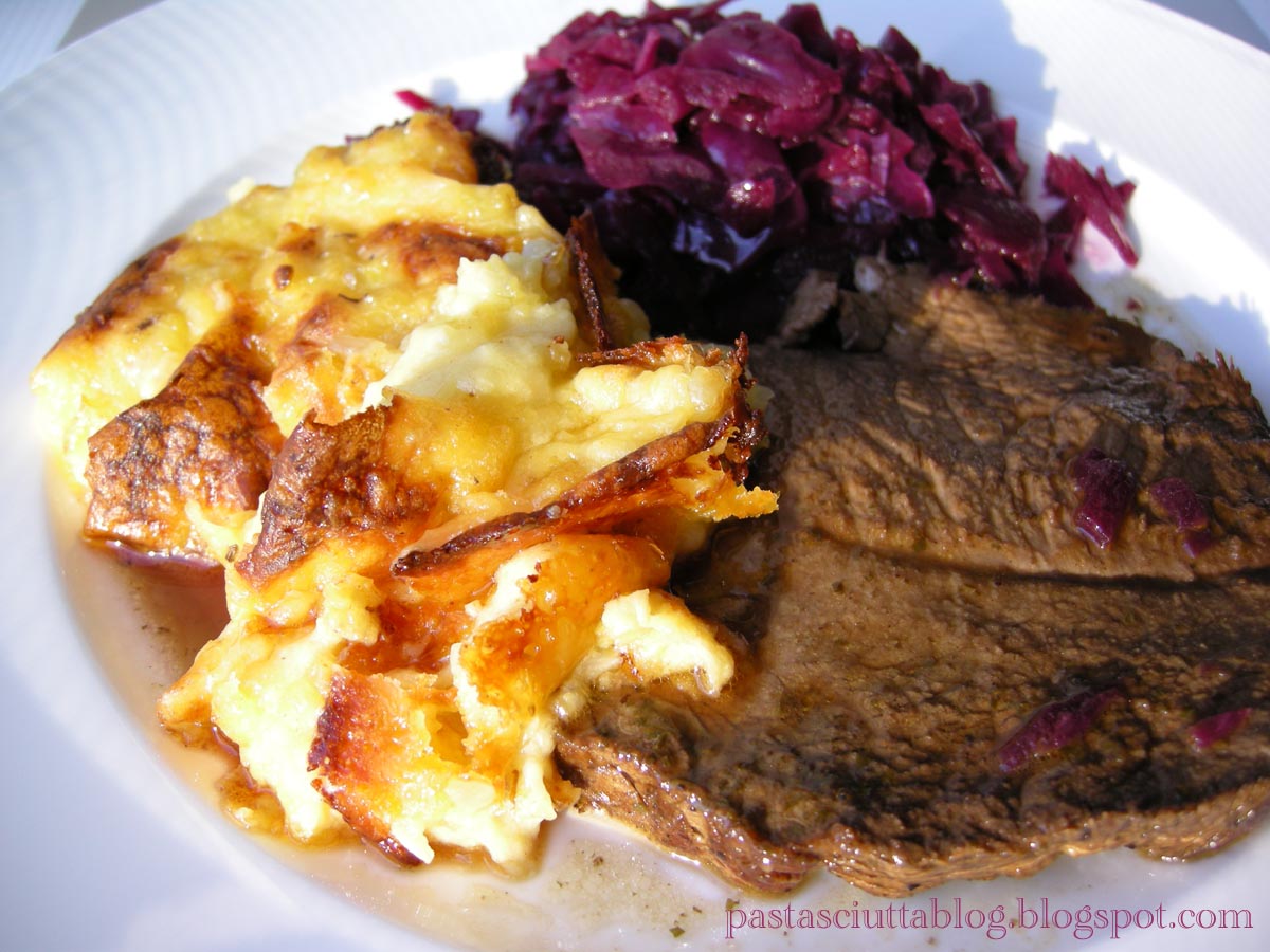 Nicht gerade mein Lieblingsessen, aber doch ein typisches Sonntagsessen. Rinderschmorbraten mit Rotkohl, dazu gratiniertes Kartoffelpüree. Den Rotkohl habe ich über Nacht mariniert und gestern mit Zwiebeln in Gänseschmalz angeschmort und mit Wein, Johannisbeergelee und Gewürzen gekocht, ganz klassisch. Das Gratin bestand aus Kartoffelpüree, Bergkäse, Sahne, Paprika, Zitronenpfeffer, zerstoßenem Kümmel und Salz. Das Fleisch wurde drei Stunden mit Gemüse und Wein geschmort und hätte durchaus noch eine klitzekleine Verlängerung vertragen.