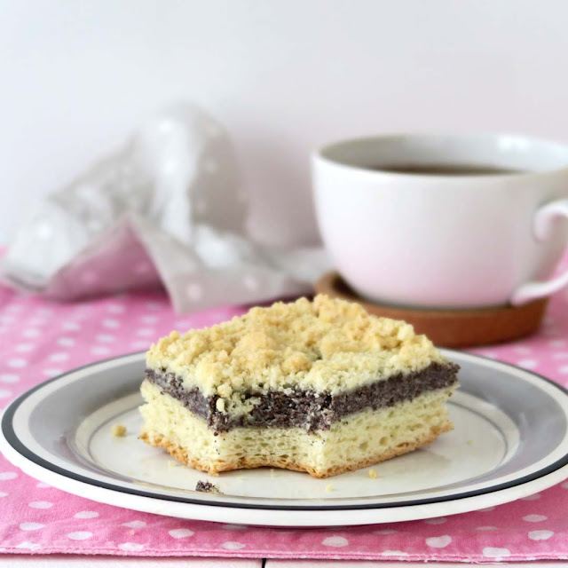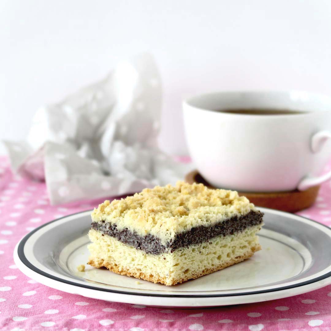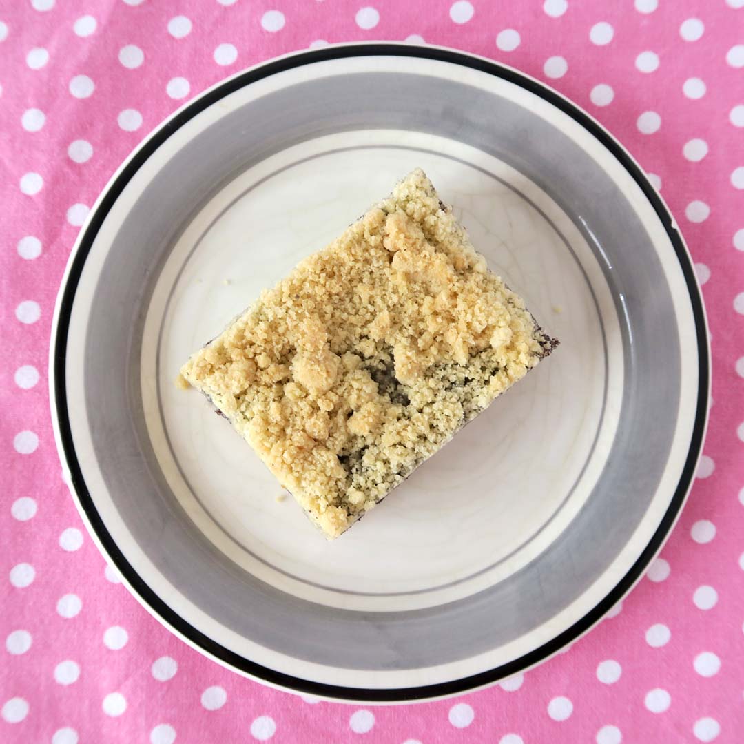 So ein Streuselkuchen von der eher stabilen Sorte gehört einfach mit der Hand gegessen. Wenn sich unter der Krümeldecke noch Cremes oder Obst befinden, sieht die Sache schon anders aus, das gebe ich gerne zu. Derart labile Schichten bringen die Statik meist ganz schön in Gefahr. Daher würde ich zum Beispiel für einen feinen Kirschstreusel jederzeit die Kuchengabel zücken. Für das zweite Stück Mohnkuchen wiederum habe ich jedenfalls auf Besteck verzichtet und hinterher den Staubsauger angeschmissen.
