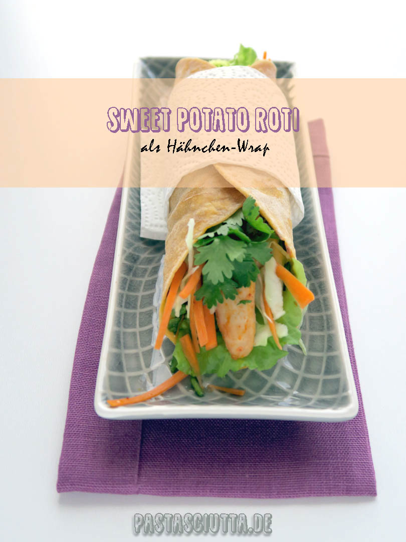 Aus den weichen Fladenbroten lassen sich dann wunderbare Wraps wickeln. Eine wohlschmeckende Verpackung in appetitlichem Orange! Wenn man von Anfang an weiß, dass die Roti zum Einwickeln von ganzen Mahlzeiten verwendet werden, macht es allerdings Sinn, sie etwas größer zu backen, als in meinem Rezept angegeben. Das ist also der Grund, weshalb ich auf dieses Rezept gewartet habe, denn Wraps liebe ich wirklich sehr. Nur schmecken mir leider diese ganzen fertigen Fladen, die es zu kaufen gibt, nicht. Das mag vielleicht jeder anders empfinden, aber ich schmecke da immer so eine säuerliche Note raus, die ich halt nicht mag.