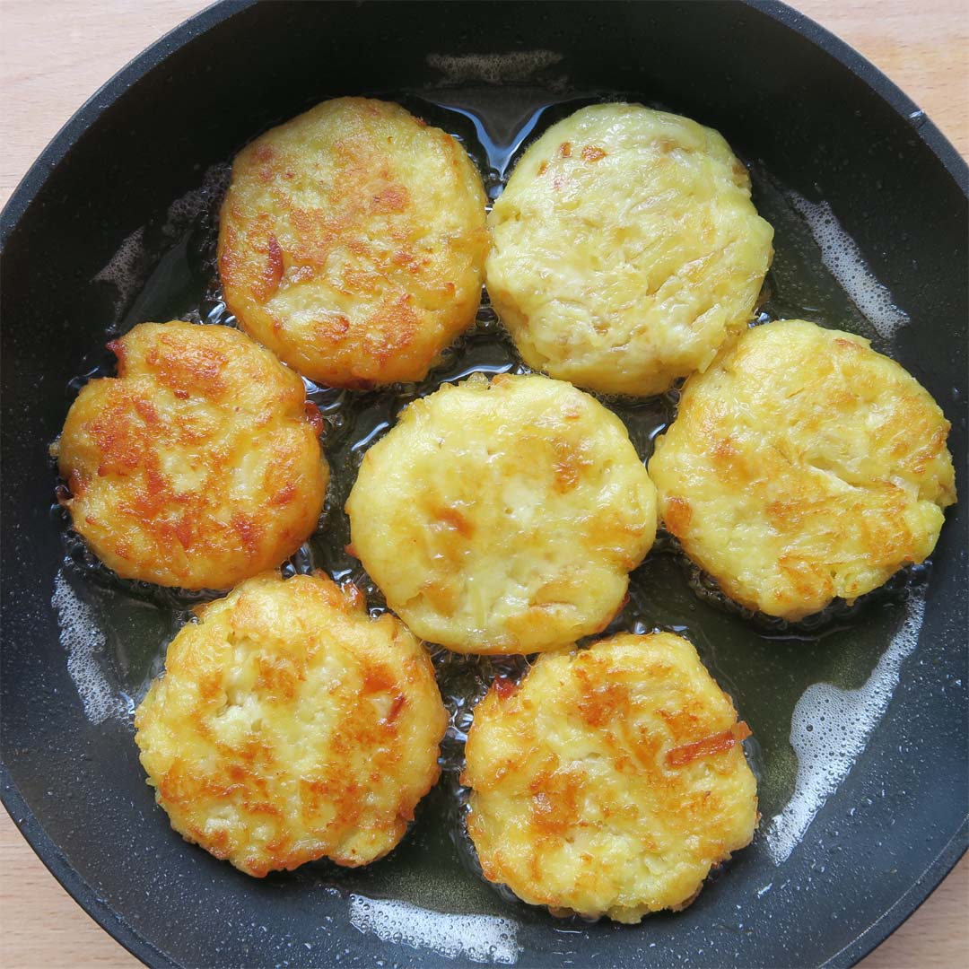 Die abgekühlten Späne rasch mit dem Kartoffelteig mischen und locker zu dicken Talern, Ecken oder Plätzchen formen. Bei mittlerer Hitze in reichlich Erdnussöl hellgelb braten. Auf einem Teller oder Tablett abkühlen lassen. Ausgebreitet auf einem Tablett oder Brett einfrieren. Die gefrorenen Röstis in einen Gefrierbeutel geben und mit Vakuumclip verschließen.