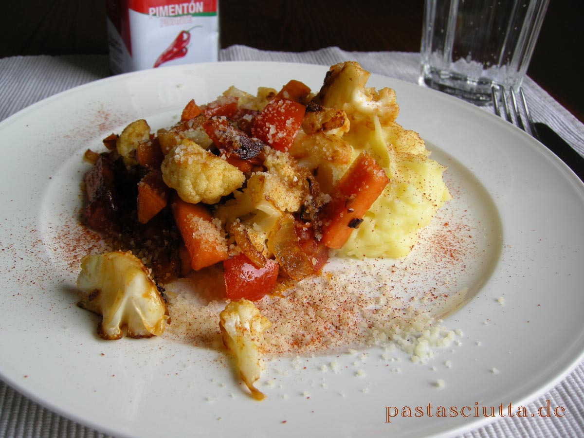 Wie, heute keine Pasta? Was ist los? – Och, Kartoffelpüree ist ja auch mal ganz lecker. Passt so schön zum Blumenkohl. Und weil alles mal wieder ganz schnell gehen sollte, mussten die kleinen Blumenkohlröschen zusammen mit Zwiebeln und Möhren in die Pfanne. In heißem Olivenöl mit etwas Salz, braun gebraten, zum Schluss ein paar Tomatenwürfelchen darüber. Mit cremigem Kartoffelpüree, einer klitzekleinen Prise Parmesan und etwas Paprikapulver wird es eine runde Sache. Wenn in meinem Kühlschrank noch ein Kotelett gewesen wäre, dann hätte ich das auch sehr gerne dazu gegessen. Ein Carameleis hat mich hinterher ganz gut getröstet.