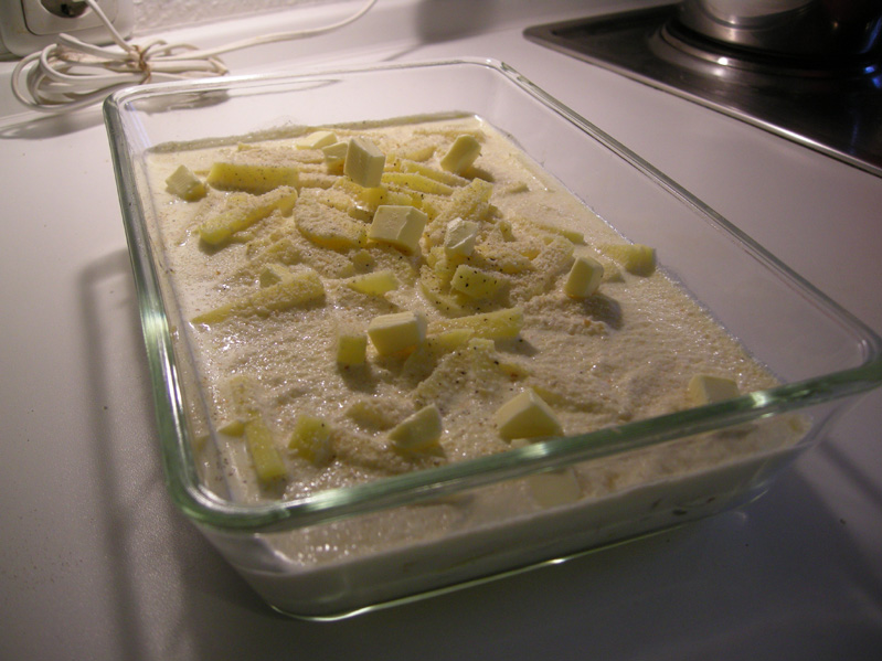 Eine Schicht Kartoffelstifte darauf betten. Milch und Sahne mit Salz und Pfeffer würzen und darüber gießen. Paniermehl darüber streuen und das Ganze mit Butterflöckchen krönen.