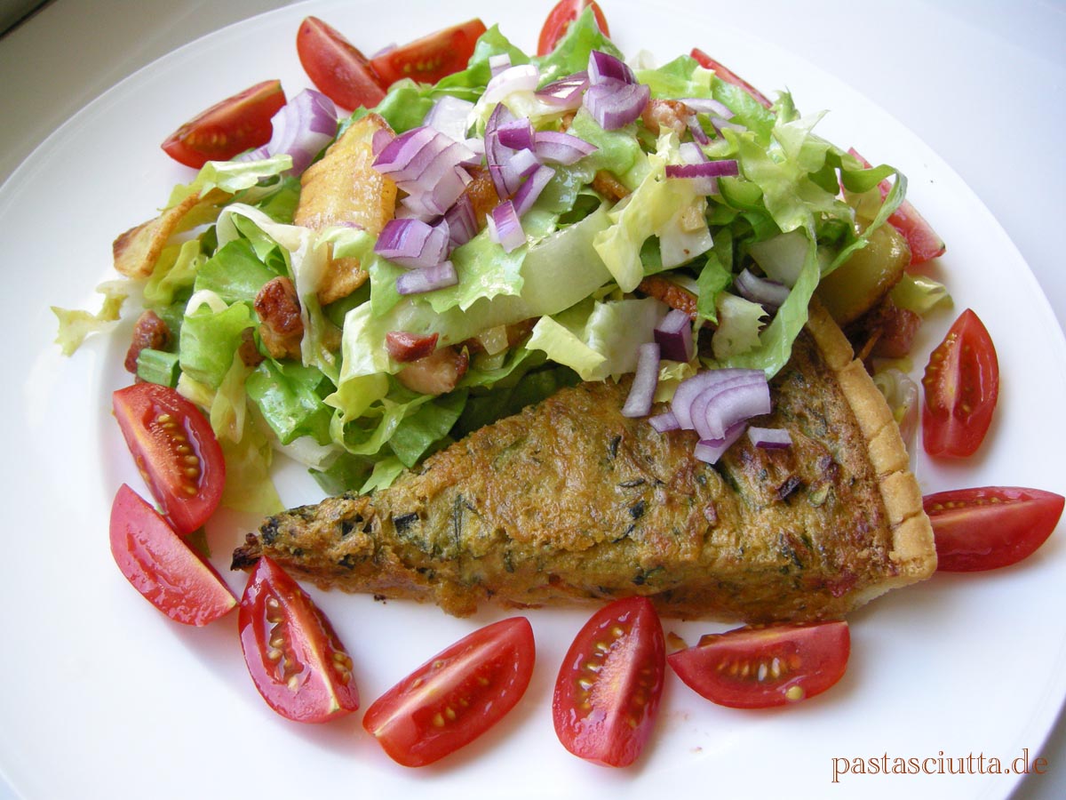 Statt einer Haxe habe ich heute ein Stück Zucchiniquiche aus meinen TK-Vorräten und ein paar Tomaten dazu gegessen. Wenn man mehr Speck und Kartoffeln als Salat nimmt, dann braucht das Gericht keine Beilagen.