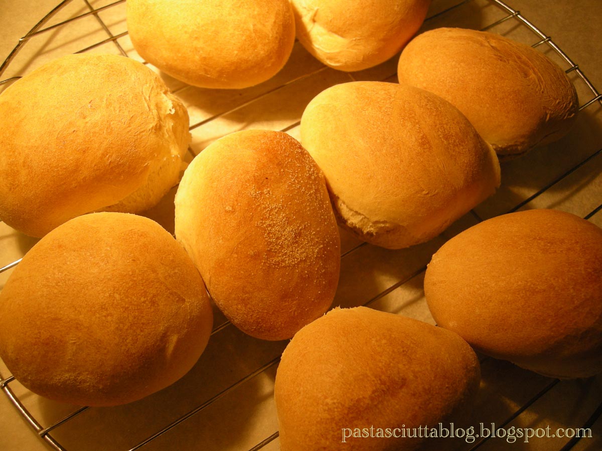 Was passierte eigentlich mit dem Rest vom Pizzateig? Der geneigte Leser kann sich bestimmt vorstellen, dass ich nicht den ganzen Teig, bestehend aus 500 g Mehl, alleine verputzt habe. – Pizzabrötchen sind die Lösung für dieses Problem! Der Schamottstein ist noch heiß und die Brötchen bekommen darauf einen besonderen Geschmack. Ideal ist, wenn ich die Brötchen forme, bevor die Pizza zubereitet wird. Dann können die Teiglinge in den warmen Küche gehen, bis die Pizzaaktion beendet ist. Zunächst lasse ich den Ofen auf Pizzastufe (knackeheiß) und nach zehn Minuten schalte ich auf 190-200° C runter. Insgesamt brauchen die Brötchen etwa 25 Minuten.