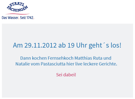 Da ich bereits das Vergnügen hatte, gemeinsam mit Staatl. Fachingen in den Töpfen zu rühren, freue ich mich sehr auf dieses Event. Und ich freue mich ganz besonders auf Euch! Hoffentlich schaut Ihr alle rein und beteiligt Euch munter auf der Twitterwall.