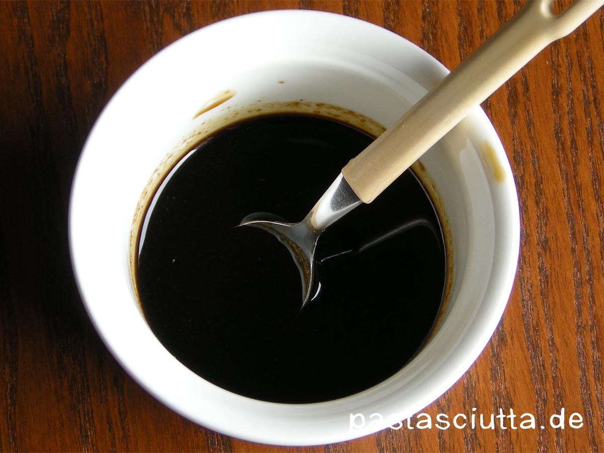 Aus 1 Tl. zerstoßenem Kreuzkümmel, 2 El. Rübenkraut, 4 El. japanischer Sojasauce, 100 ml. ungesalzener Kalbsbrühe entstand eine herrliche Reduktion, die unübertroffen gut zu Schweinefleisch passt. Alle Zutaten zusammenrühren und in einem Topf auf etwa die Hälfte reduzieren. Das geht recht schnell und sollte mit etwas Gefühl geschehen, damit die Reduktion nicht unerwünschte Aromen entwickelt. Rach nimmt im Originalrezept Honig, salzarme Sojasauce und Hühnerbrühe. Ich denke, das Ergebnis dürfte recht ähnlich sein.